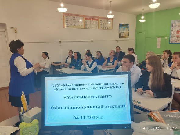 Бүгін «Макашевка негізгі мектебі» КММ — жалпыұлттық диктант-мемлекеттік тіл мәртебесін нығайтуға және азаматтар арасында сауаттылықты дамытуға бағытталған ауқымды мәдени-ағартушылық акция өтті. Мақсаты: қазақ тілінде сауатты жазудың тұрақты дағдыларын қалыптастыру, тіл мәдениетін арттыру және мемлекеттік тілге құрметпен қараудың маңыздылығын атап өту.